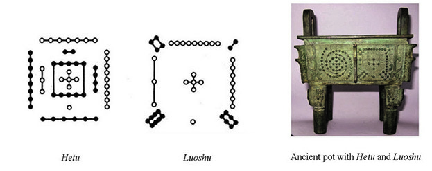 基本思想来自河图。河图与洛书一起一般认为是中华文明之始。《易经系辞》曰:“河出图,洛出书,圣人则之。”后世的太极、八卦、风水等皆可追源至此。河图与洛书包含了数的奇偶分类、“等差”“等和”的排列、幻方等数学内容,本质上是古人对数与数学的朴素的认识。河图也常画成圆形的,如右图古鼎的左半部所示。